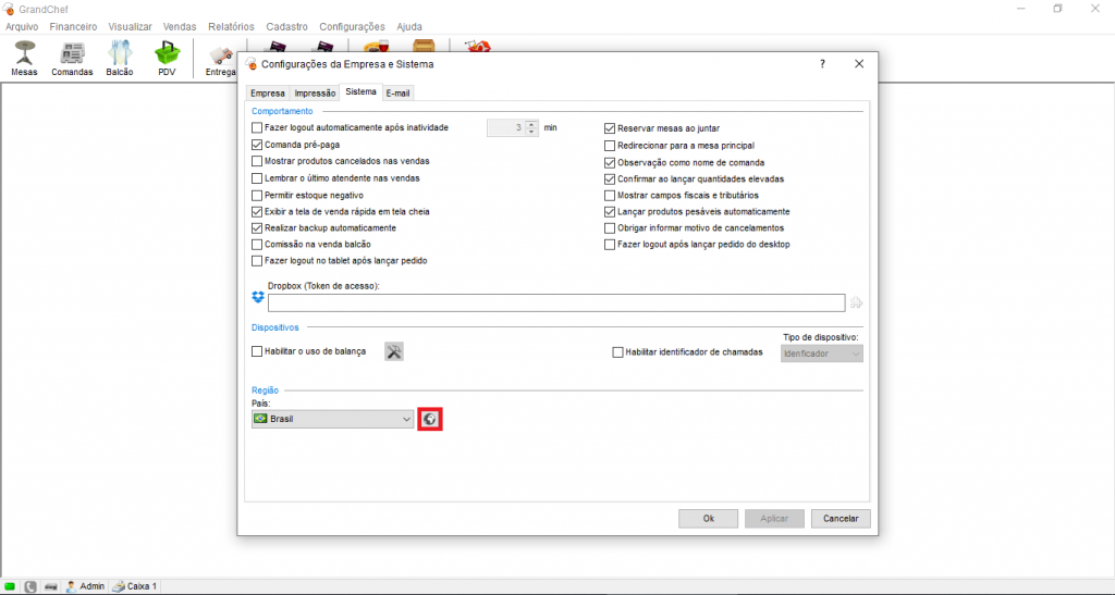 Após isso, clique na aba “Sistema”. No campo “País”, clique sobre o “globo”.
