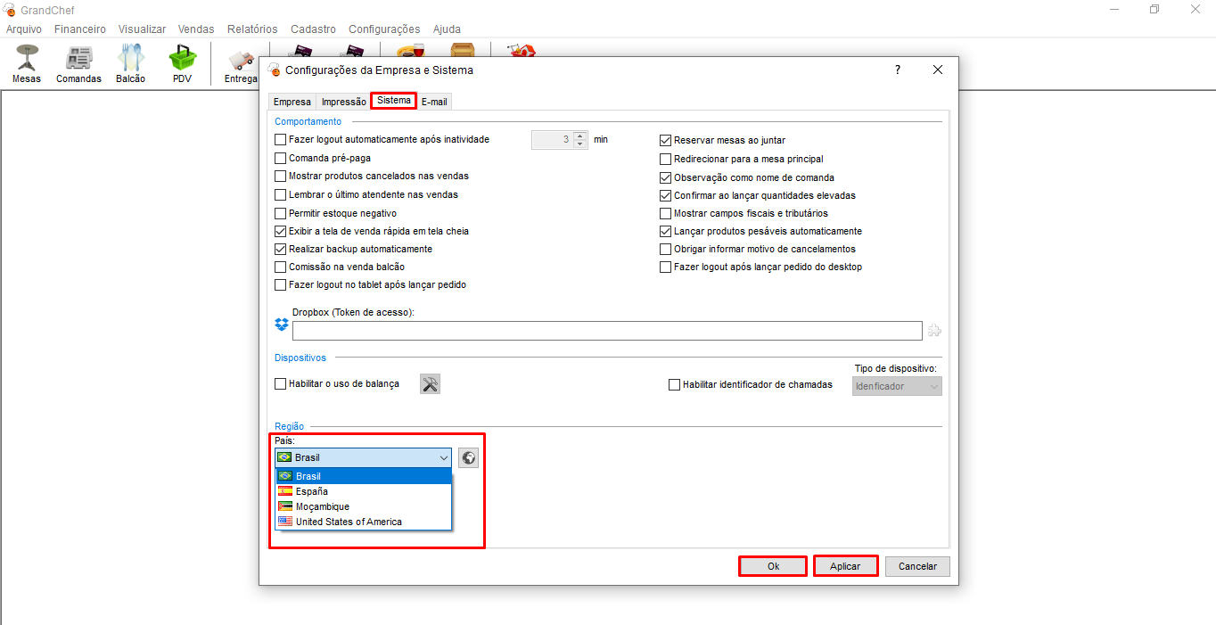 É bem simples! Vamos lá, com o sistema GrandChef aberto, clique na aba de “configurações” e clique em “empresa e sistema” e vá na aba de “Sistema”.