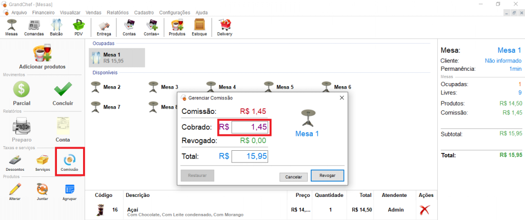 Como podemos verificar o valor da comissão foi alterado, juntamente com o total do pedido.