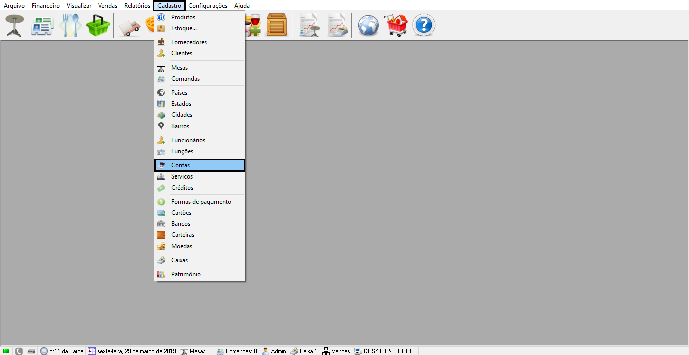 Primeiramente, com o GrandChef aberto, clique em “Cadastro” > “Contas”.