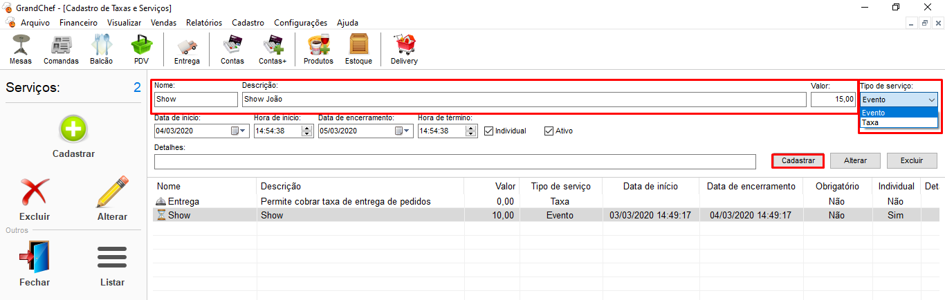 Existem dois tipos de serviços “Evento” onde poderá preencher a data e a hora do inicio e o fim do evento, “Taxa” não precisa especificar a data e hora, depois finalize clicando em “Cadastrar”.