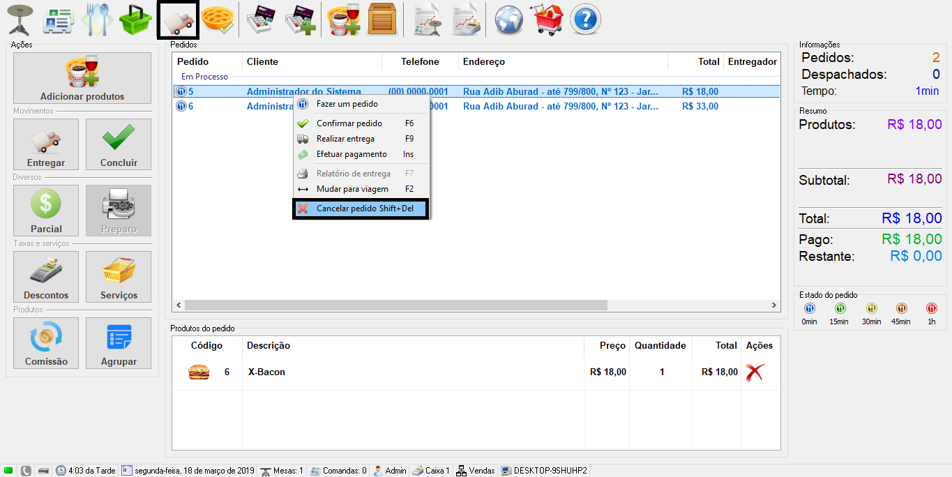 Clique com o botão direito do seu mouse sobre o pedido que deseja cancelar.