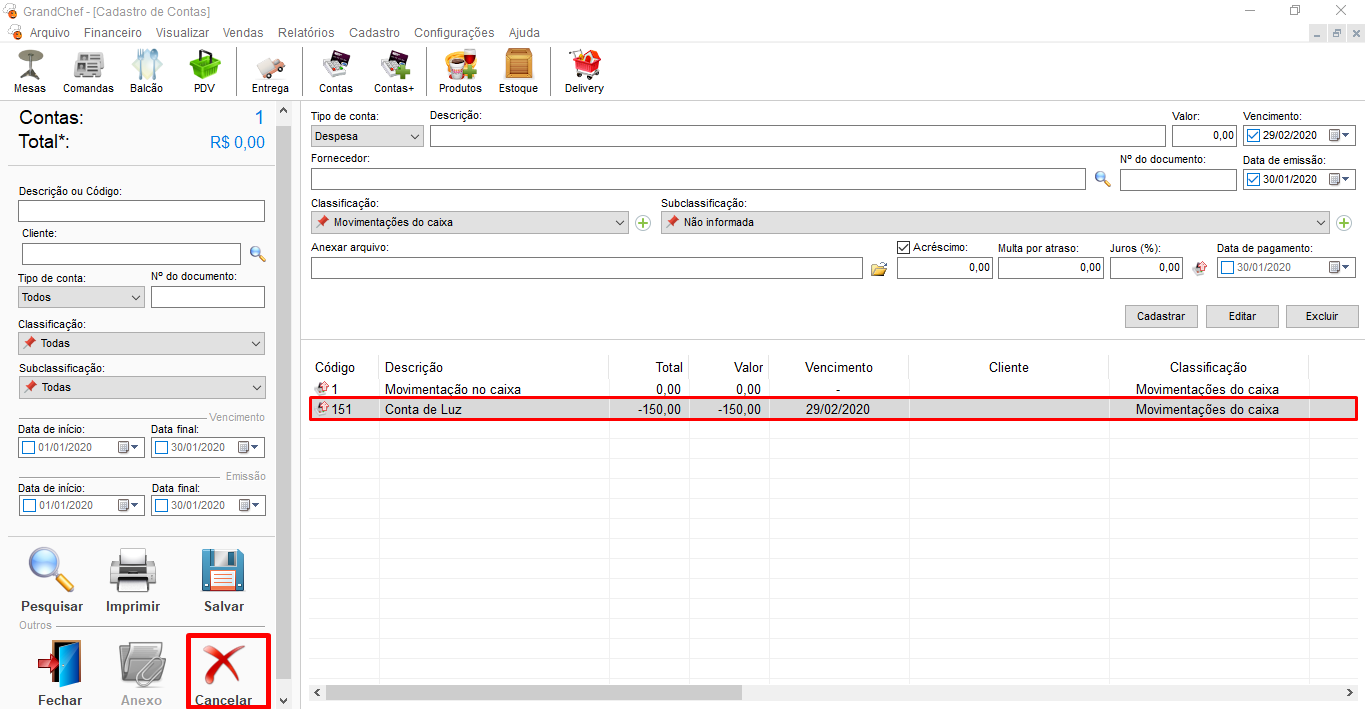 Para isso é necessário que o caixa que a conta foi cadastrada ainda esteja aberto, caso ele já tenha sido fechado, não será possível cancela-la.