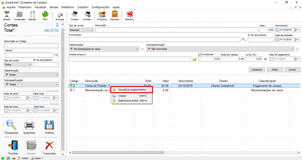 Selecione o pedido que deseja com o botão direito, e clique em “visualizar pagamentos”.