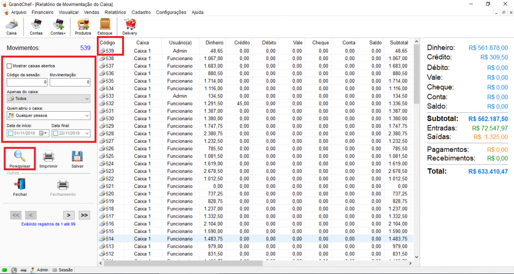 Para isso utilizamos a busca por sessão e movimentação, onde buscará informações somente dos caixa(s) que deseja.