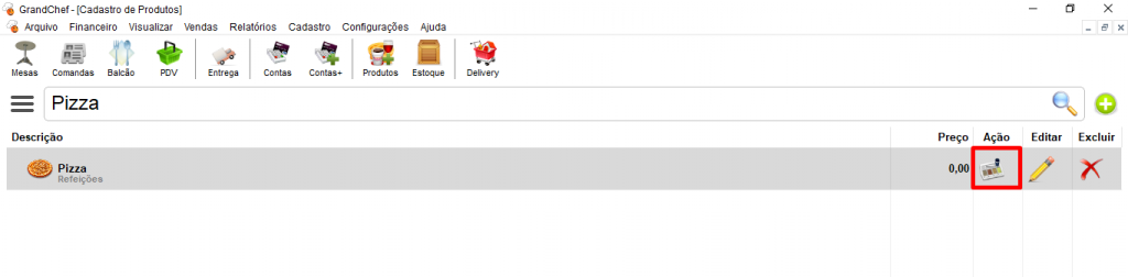 Selecione o produto desejado. Na aba de ação, clique no ícone de pacote.