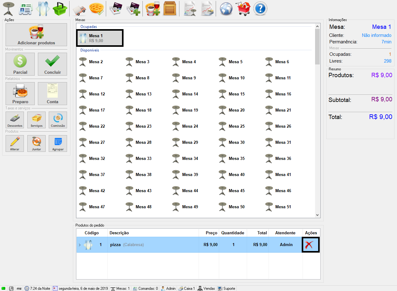Com o GrandChef já aberto, selecione a mesa/comanda, localize o produto a ser cancelado e clique no botão cancelar.