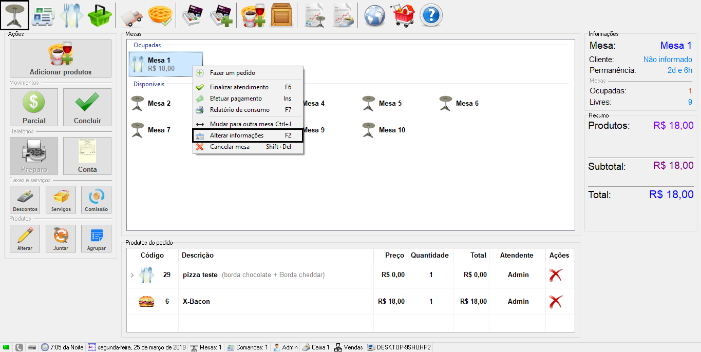 Em “Cliente”, informe o nome da pessoa que ira ocupar a mesa.