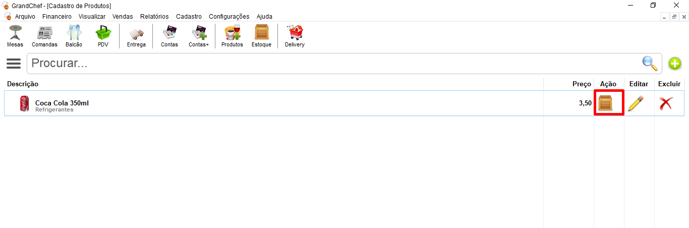 Clique na aba de ação > estoque (caixote). Irá abrir uma tela onde já irá filtrar pelo código e nome do produto selecionado.