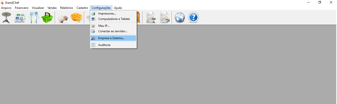 Com o GrandChef aberto, clique em configurações > Empresa e Sistema.