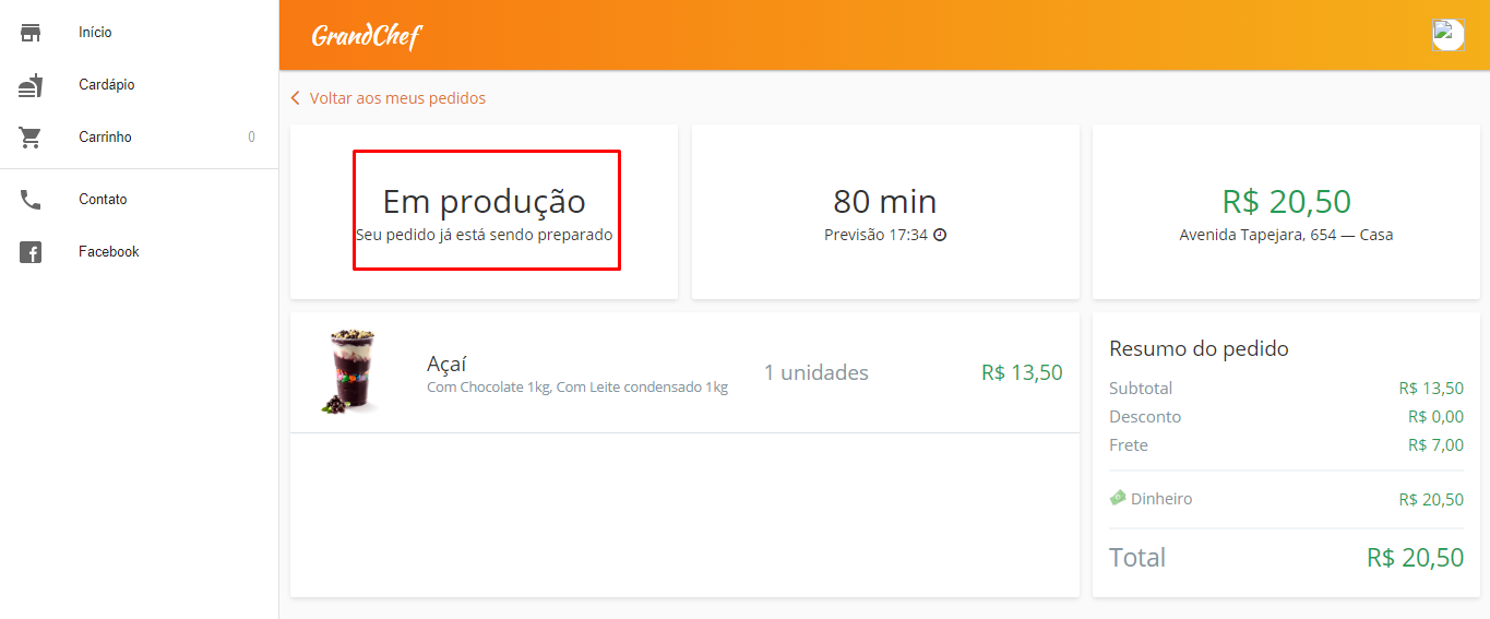Assim, status do pedido será atualizado automaticamente para o cliente, deixando como: “Pedido pronto”.