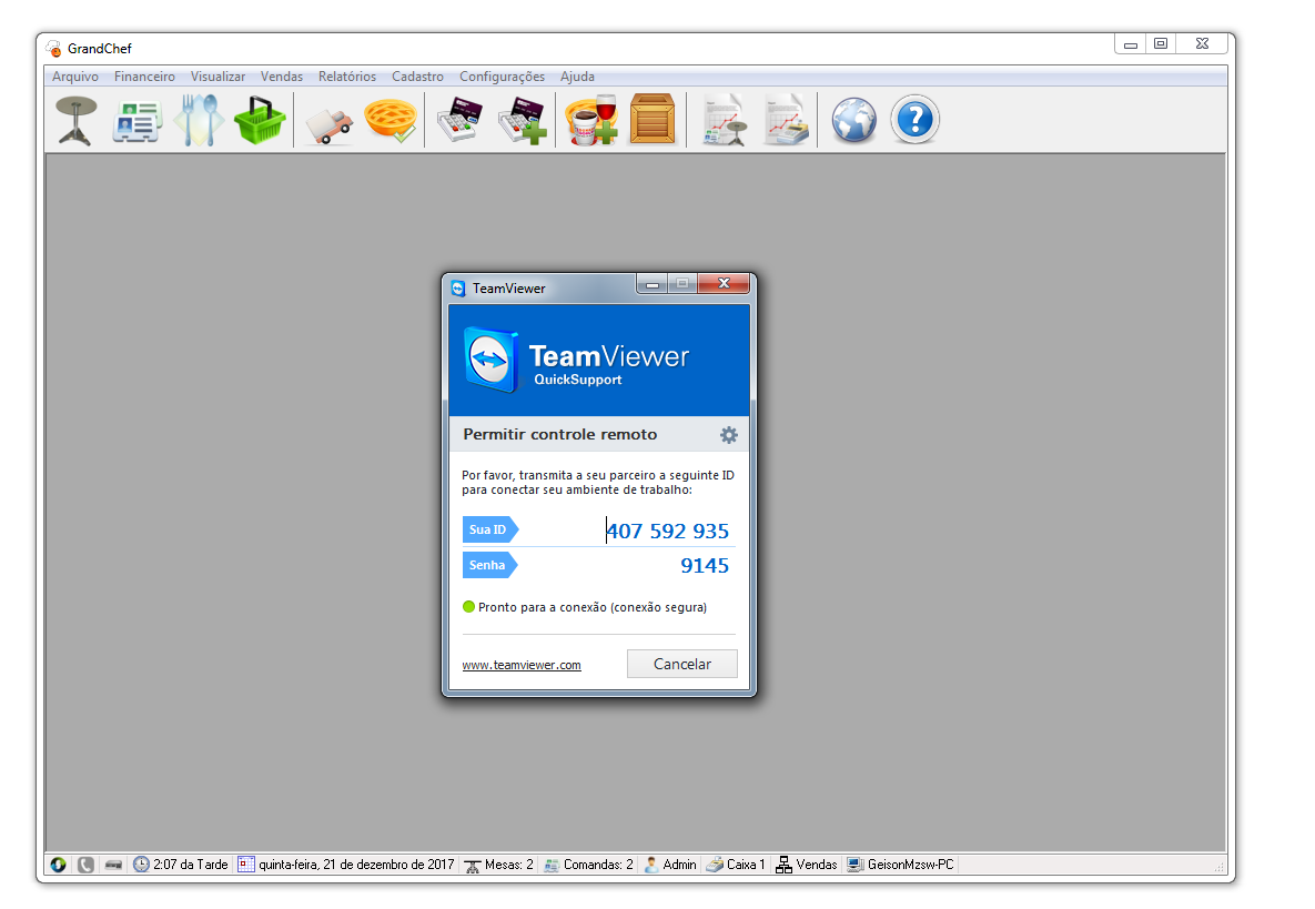 Através de um programa de acesso remoto (chamado TeamViewer), nossa equipe de Suporte Técnico poderá ver o que está ocorrendo no seu computador e auxiliá-lo na utilização e esclarecimento de dúvidas sobre o GrandChef.
