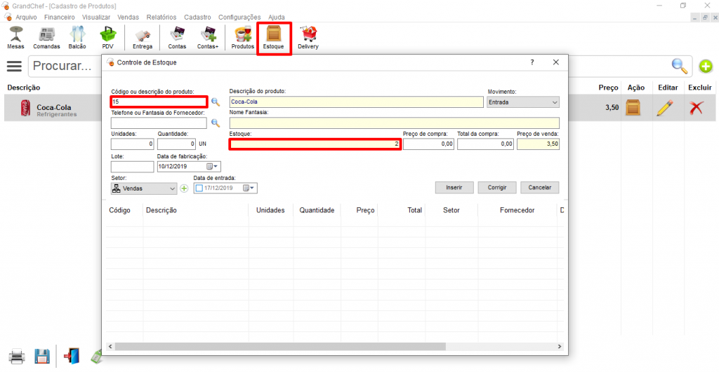 Clique na aba de estoque (caixote). Irá abrir uma tela onde você pode filtrar pelo código ou nome do produto.