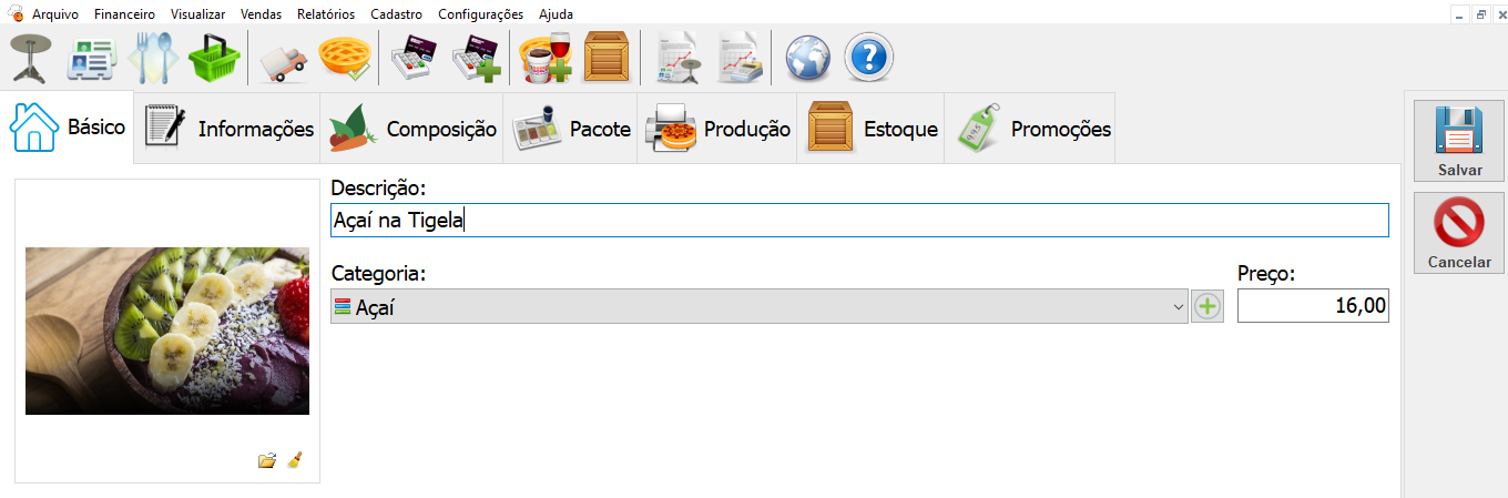 Composição: Insumo essencial do produto, no caso Açaí na Tigela, toda vez que realizar uma venda será dado baixa de 500g do insumo Polpa de açaí.