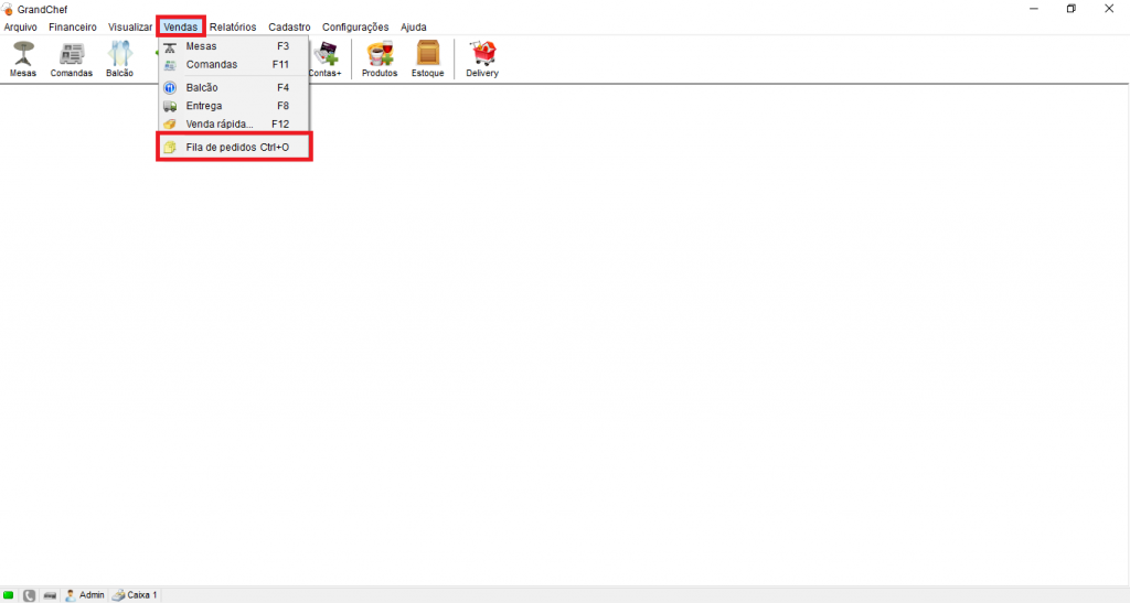 Para acessar a fila de pedidos, deve abrir a aba de “vendas” > “fila de pedidos”. (Atalho: Crtl + O).