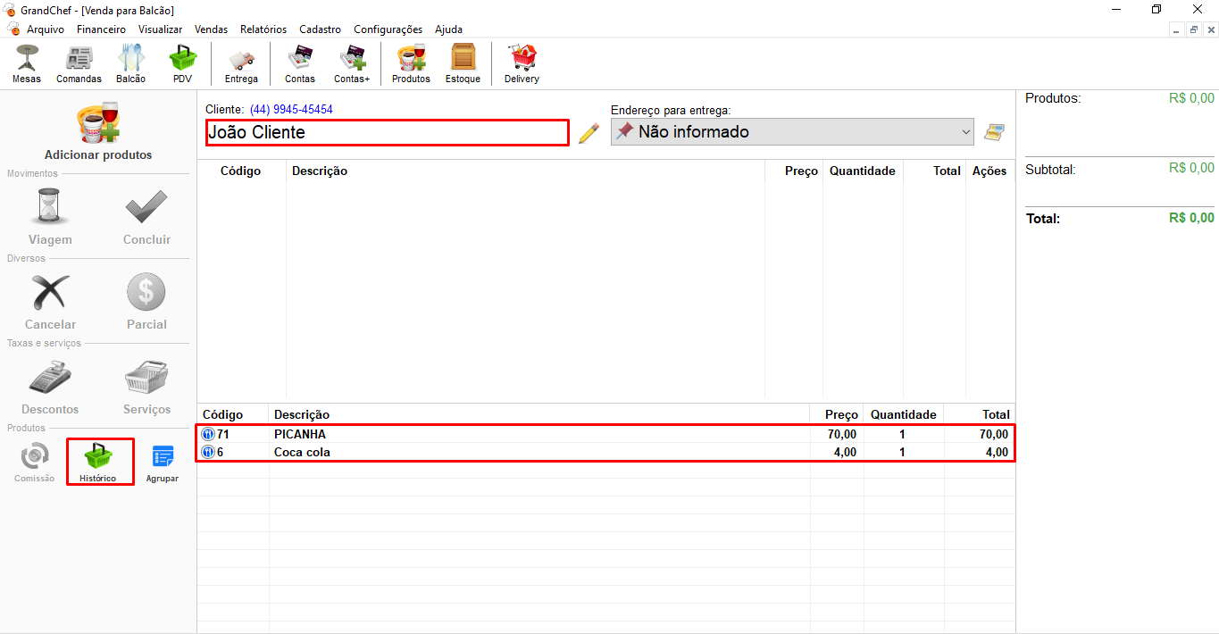 Ao selecionar o cliente na venda balcão, na parte inferior, o sistema já dará algumas opções de produtos que o cliente já consumiu em vendas balcão.