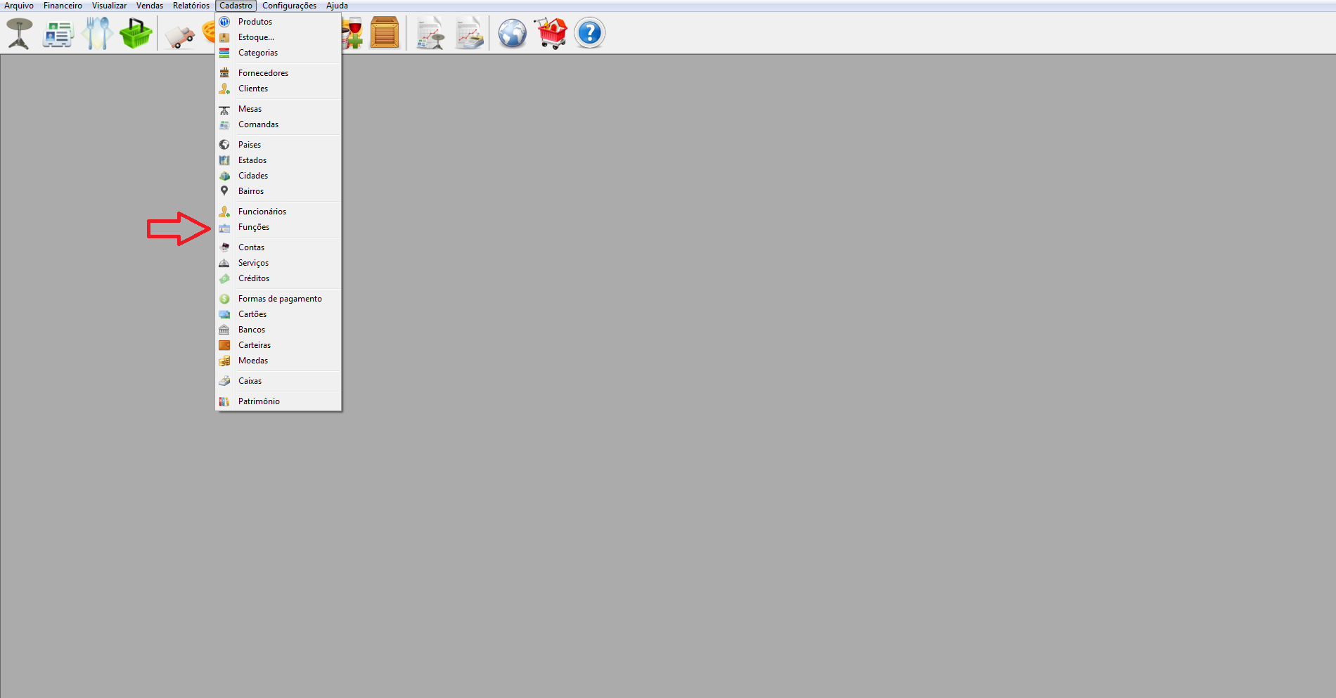 Primeiramente abra seu sistema GrandChef, acesse a aba “Cadastro” > “Funções”.