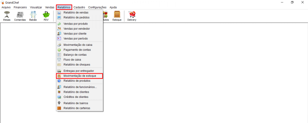 Com o sistema GrandChef aberto, clique em “Relatório” > “Movimentação de estoque”.