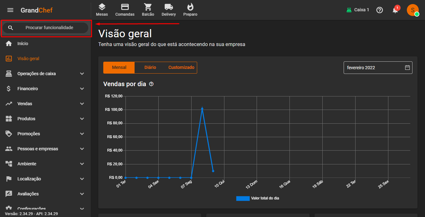 Para facilitar a busca por funcionalidades do sistema, o GrandChef Online disponibiliza um campo de busca pra procurá-las.